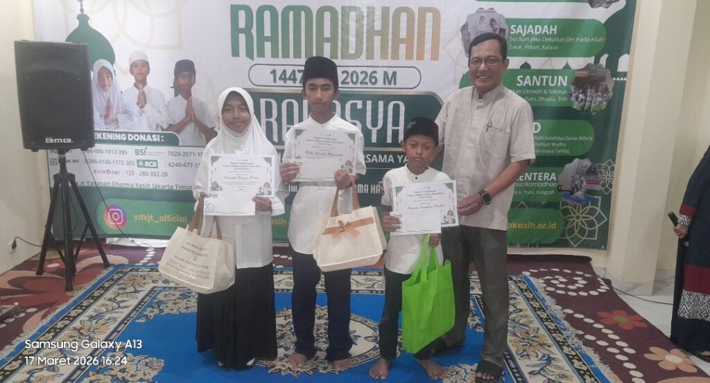 Asmen.id, Jakarta——Yayasan Dharma Kasih Jakarta Timur (YDKJT) menyelenggarakan kegiatan santunan anak yatim, pembagian Tunjangan Hari Raya (THR), serta pengumuman pemenang Lomba Edukasi Nuansa Ramadan (LENTERA) dalam rangka memeriahkan bulan suci Ramadan. Kegiatan ini berlangsung di kawasan Cakung Timur dan menjadi bagian dari agenda tahunan yayasan. Selasa, 17 Maret 2026 di Istana Yatim Yayasan Dharma Kasih Jakarta Timur.